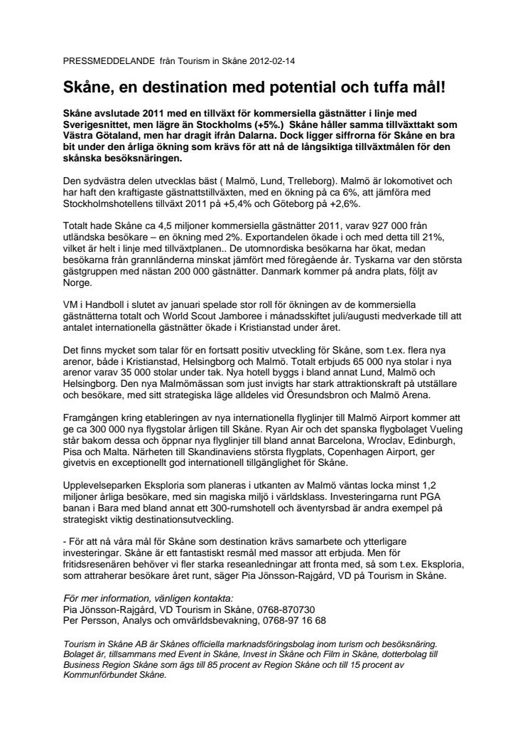 Skåne avslutade 2011 med en tillväxt för kommersiella gästnätter i linje med Sverigesnittet, men lägre än Stockholms (+5%.) Skåne håller samma tillväxttakt som Västra Götaland, men har dragit ifrån Dalarna. Dock ligger siffrorna för Skåne en bra bit under den årliga ökning som krävs för att nå de långsiktiga tillväxtmålen för den skånska besöksnäringen.