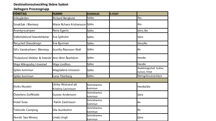 Lista över företag som medverkar i processgruppen bifogas. Gruppens första workshop hålls den 5/2 på Hotel Svea i Simrishamn kl. 09.30-16.30. Press välkomnas efter mötet, kl. 16.30.