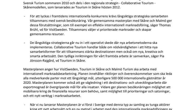 - För att lyckas i framtidens internationella konkurrens krävs långsiktiga strategiska samarbeten tillsammans med svensk besöksnäring. Vår gemensamma masterplan med Skåne och Malmö ger dessa förutsättningar, som till exempel en effektiv internationell marknadsföring, säger Thomas Brühl, vd för VisitSweden. Tillsammans väljer vi prioriterade marknader och skapar gemensamma resurser.