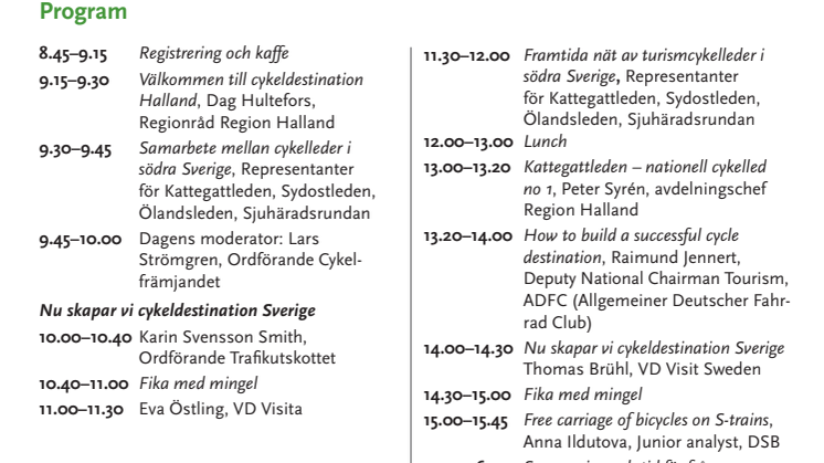 Talare är bland andra Trafikutskottets ordförande Karin Svensson Smith, Visitas VD Eva Östling och Thomas Brühl, VD för Visit Sweden. Dessutom kommer Raimund Jennert från ADFC (Allgemeiner Deutscher Fahrrad Club) och Anna Ildutova från DSB.