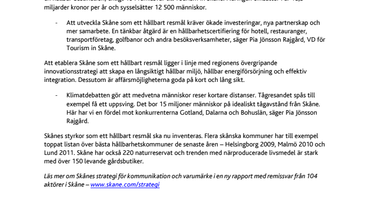 Skånes styrkor som ett hållbart resmål ska nu inventeras. Flera skånska kommuner har till exempel toppat listan över bästa hållbarhetskommuner de senaste åren – Helsingborg 2009, Malmö 2010 och Lund 2011. Skåne har också 220 naturreservat och trenden med närproducerade livsmedel är stark med över 150 levande gårdsbutiker.