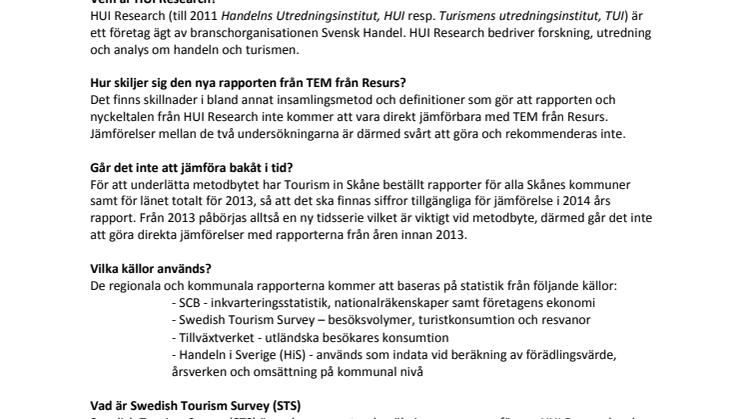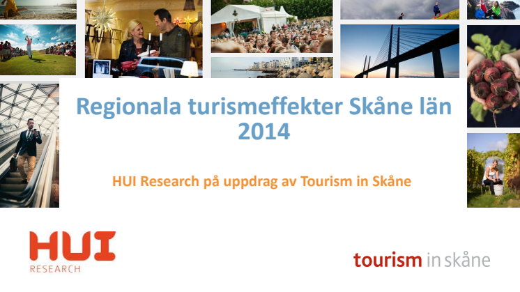 HUI Research har på uppdrag av Tourism in Skåne tagit fram regionala turismeffekter för Skåne län 2014. Denna rapport belyser bland annat turismomsättning, genererade arbetstillfällen, förädlingsvärdet i branschen, andelen av BRP och kommersiella gästnätter.