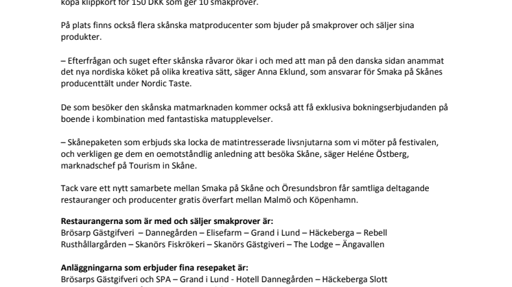 – Skånepaketen som erbjuds ska locka de matintresserade livsnjutarna som vi möter på festivalen, och verkligen ge dem en oemotståndlig anledning att besöka Skåne, säger Heléne Östberg, marknadschef på Tourism in Skåne.