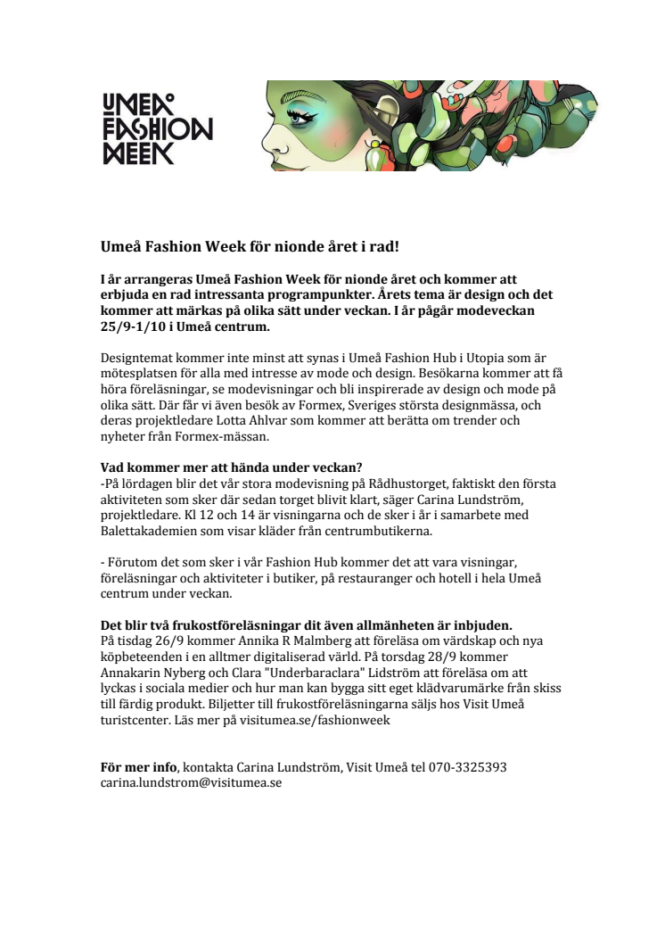 I år arrangeras Umeå Fashion Week för nionde året och kommer att erbjuda en rad intressanta programpunkter. Årets tema är design och det kommer att märkas på olika sätt under veckan. I år pågår modeveckan 25/9-1/10 i Umeå centrum.