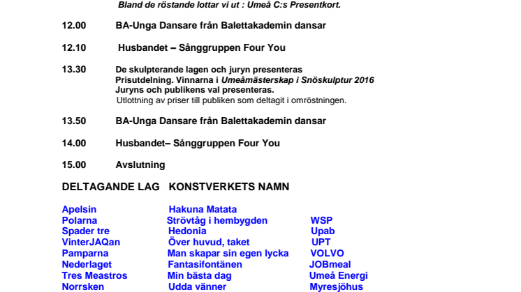 På fredag är det dags för den 25:e upplagan av Umeåmästerskapen i snöskulptur – ett av de mest folkkära arrangemangen i Umeå centrum. Årets tema är "Livskvalitet” . Det är ett tema som sätter igång tankar hos de flesta av oss och som många kan relatera till. Det vinnande laget utses på Rådhustorget på lördagen kl. 13:30.