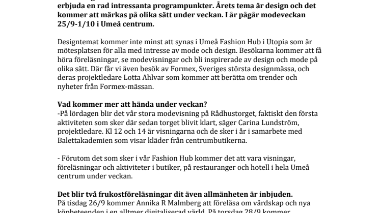 Designtemat kommer inte minst att synas i Umeå Fashion Hub i Utopia som är mötesplatsen för alla med intresse av mode och design. Besökarna kommer att få höra föreläsningar, se modevisningar och bli inspirerade av design och mode på olika sätt. Där får vi även besök av Formex, Sveriges största designmässa, och deras projektledare Lotta Ahlvar som kommer att berätta om trender och nyheter från Formex-mässan.