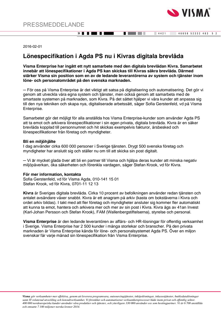 Visma Enterprise har ingått ett nytt samarbete med den digitala brevlådan Kivra. Samarbetet innebär att lönespecifikationer i Agda PS kan skickas till Kivras säkra brevlåda. Därmed stärker Visma sin position som en av de ledande leverantörerna av system och tjänster inom löne- och personalområdet på den svenska marknaden.