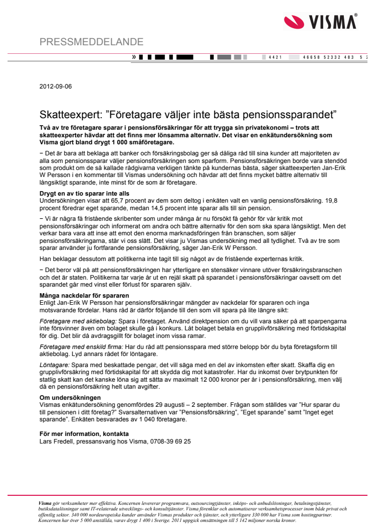 Två av tre företagare sparar i pensionsförsäkringar för att trygga sin privatekonomi – trots att skatteexperter hävdar att det finns mer lönsamma alternativ. Det visar en enkätundersökning som Visma gjort bland drygt 1 000 småföretagare.