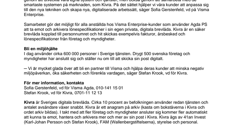 Samarbetet gör det möjligt för alla anställda hos Visma Enterprise-kunder som använder Agda PS att ta emot och arkivera lönespecifikationer i sin egen privata, digitala brevlåda. Kivra är en säker brevlåda kopplad till personnumret och hit skickas exempelvis fakturor, årsbesked och lönespecifikationer från företag och myndigheter.