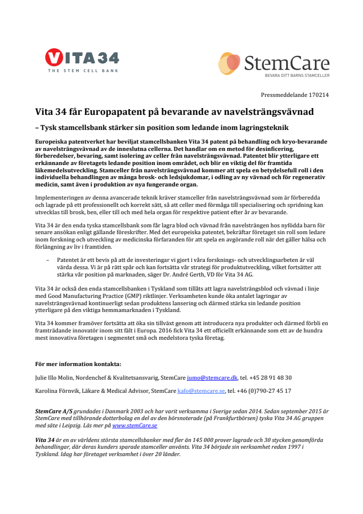 Tysk stamcellsbank med svensk verksamhet stärker sin position som ledande inom lagringsteknik. Europeiska patentverket har beviljat stamcellsbanken Vita 34 patent på behandling och kryo-bevarande av navelsträngsvävnad av de inneslutna cellerna. Det handlar om en metod för desinficering, förberedelser, bevaring, samt isolering av celler från navelsträngsvävnad.