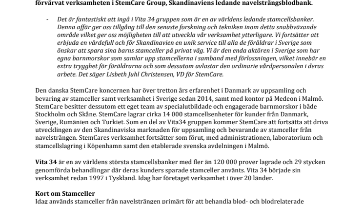 Den danska StemCare koncernen har över tretton års erfarenhet i Danmark av uppsamling och bevaring av stamceller samt verksamhet i Sverige sedan 2014, samt med kontor på Medeon i Malmö. StemCare besitter dessutom ett eget team av specialutbildade och engagerade barnmorskor i både Stockholm och Skåne. StemCare lagrar cirka 14 000 stamcellsenheter för kunder från Danmark, Sverige, Rumänien och Turkiet. Som en del av Vita34 gruppen kommer StemCare att fortsätta att driva utvecklingen av den Skandinaviska marknaden för uppsamling och bevarande av stamceller från navelsträngen. StemCares verksamhet fortsätter som förut, med administrationen, laboratorium och stamcellslagring i Köpenhamn samt den etablerade svenska avdelningen i Malmö.