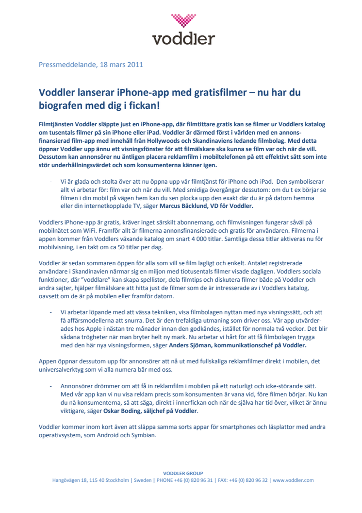 Filmtjänsten Voddler släppte just en iPhone-app, där filmtittare gratis kan se filmer ur Voddlers katalog om tusentals filmer på sin iPhone eller iPad. Voddler är därmed först i världen med en annonsfinansierad film-app med innehåll från Hollywoods och Skandinaviens ledande filmbolag. Med detta öppnar Voddler upp ännu ett visningsfönster för att filmälskare ska kunna se film var och när de vill.