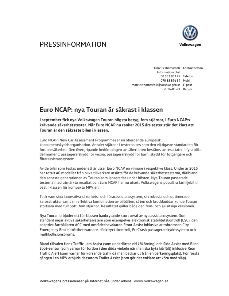 I september fick nya Volkswagen Touran högsta betyg, fem stjärnor, i Euro NCAP:s krävande säkerhetstester. När Euro NCAP nu rankar 2015 års tester står det klart att Touran är den säkraste bilen i klassen.