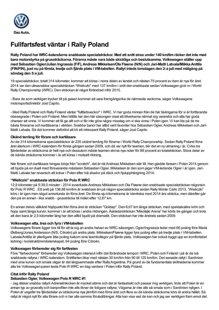 Rally Poland har WRC-kalenderns snabbaste specialsträckor. Med ett snitt strax under 140 km/tim räcker det inte med bara motorstyrka på grussträckorna. Förarna måste vara både skickliga och beslutsamma. Volkswagen ställer upp med Sébastien Ogier/Julien Ingrassia (F/F), Andreas Mikkelsen/Ola Fløene (N/N) och Jari-Matti Latvala/Miikka Anttila (FIN/FIN).