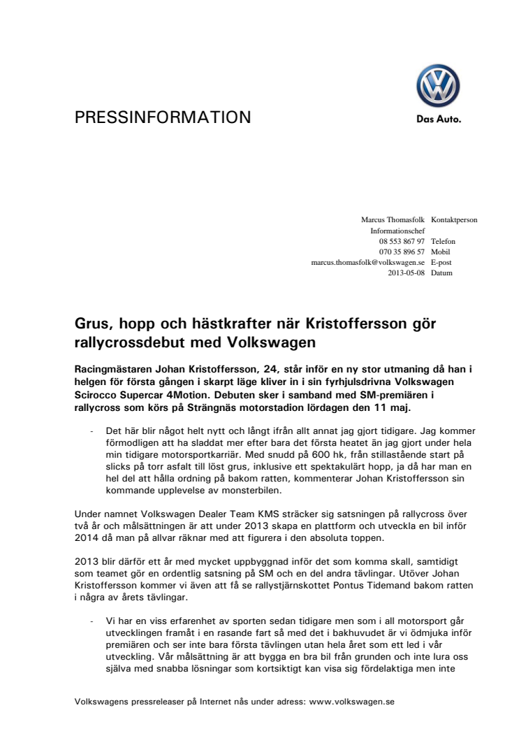 Racingmästaren Johan Kristoffersson, 24, står inför en ny stor utmaning då han i helgen för första gången i skarpt läge kliver in i sin fyrhjulsdrivna Volkswagen Scirocco Supercar 4Motion. Debuten sker i samband med SM-premiären i rallycross som körs på Strängnäs motorstadion lördagen den 11 maj.