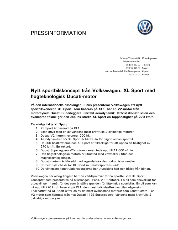 På den internationella bilsalongen i Paris presenterar Volkswagen ett nytt sportbilskoncept. XL Sport, som baseras på XL1, har en V2-motor från motorcykeln Ducati Superleggera. Perfekt aerodynamik, lättviktskonstruktion och avancerad teknik ger den 200 hk starka XL Sport en topphastighet på 270 km/h.