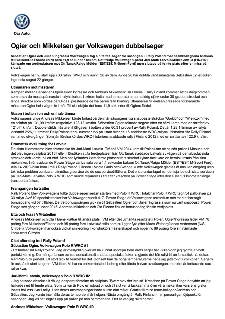 Sébastien Ogier och Julien Ingrassia Volkswagen tog sin femte seger för säsongen i Rally Poland med teamkollegorna Andreas Mikkelsen/Ola Fløene (N/N) bara 11,9 sekunder bakom. Det tredje Volkswagen-paret Jari-Matti Latvala/Miikka Anttila (FIN/FIN) kämpade om tredjeplatsen mot Ott Tanak/Raigo Mölder (EST/EST, M-Sport-Ford) men slutade på femte plats efter en miss på slutet.