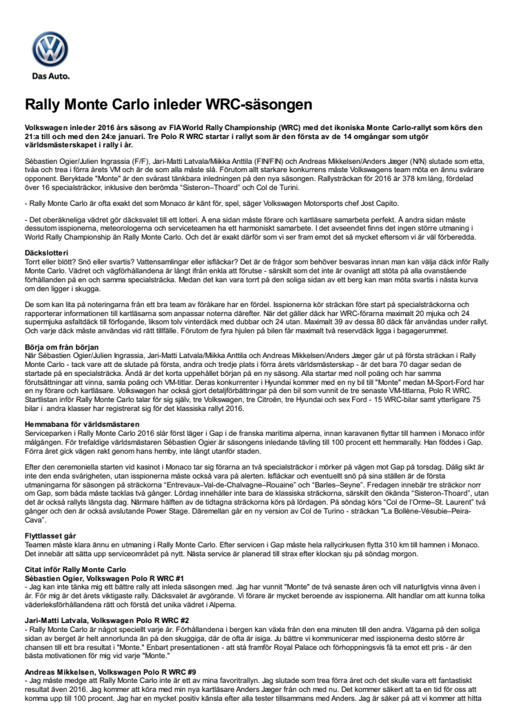 Volkswagen inleder 2016 års säsong av FIA World Rally Championship (WRC) med det ikoniska Monte Carlo-rallyt som körs den 21:a till och med den 24:e januari. Tre Polo R WRC startar i rallyt som är den första av de 14 omgångar som utgör världsmästerskapet i rally i år.