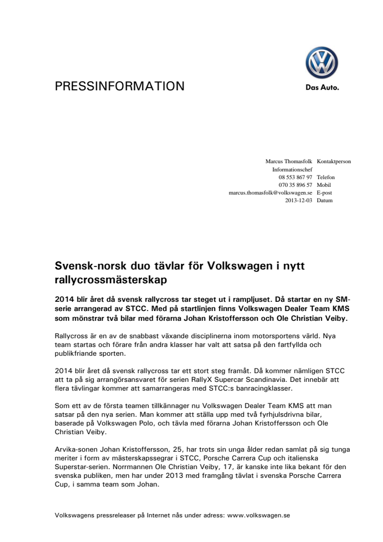 2014 blir året då svensk rallycross tar steget ut i rampljuset. Då startar en ny SM-serie arrangerad av STCC. Med på startlinjen finns Volkswagen Dealer Team KMS som mönstrar två bilar med förarna Johan Kristoffersson och Ole Christian Veiby.