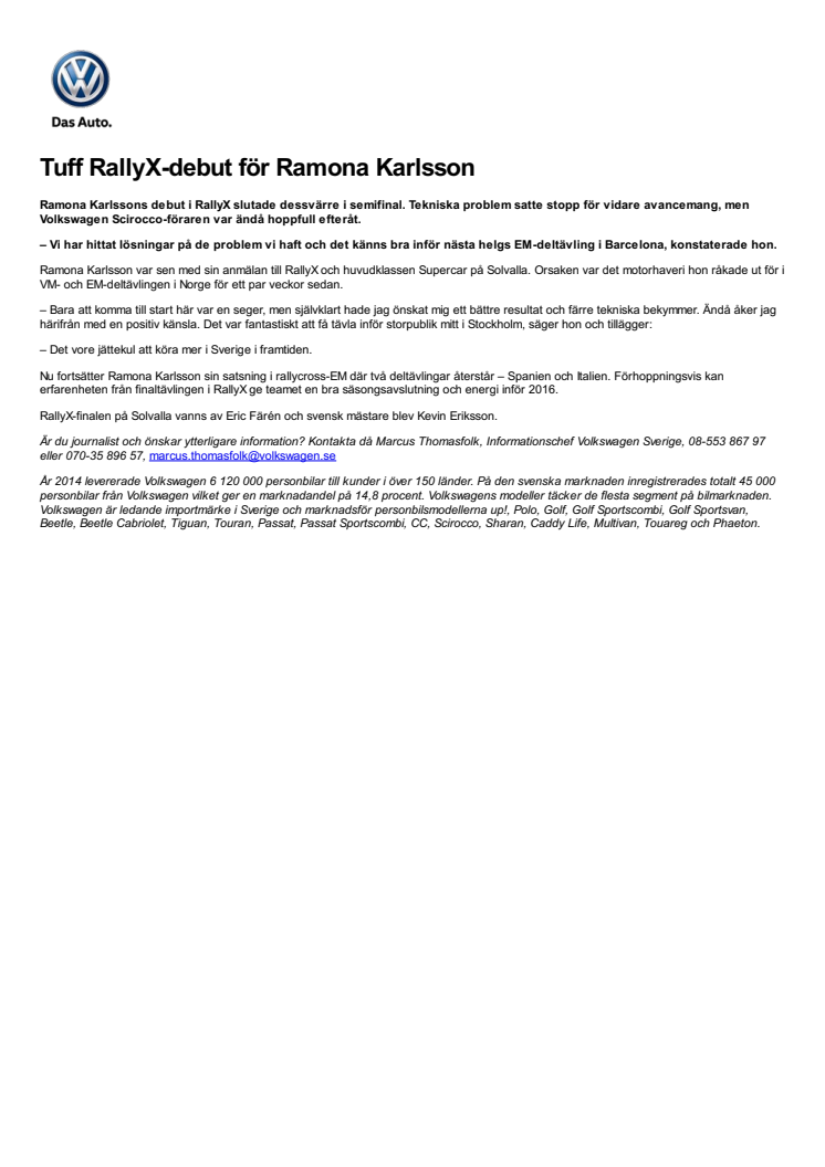 Ramona Karlssons debut i RallyX slutade dessvärre i semifinal. Tekniska problem satte stopp för vidare avancemang, men Volkswagen Scirocco-föraren var ändå hoppfull efteråt.