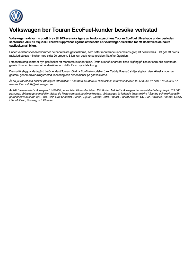 Volkswagen skickar nu ut ett brev till 945 svenska ägare av fordonsgasdrivna Touran EcoFuel tillverkade under perioden september 2005 till maj 2009. I brevet uppmanas ägarna att besöka en Volkswagen-verkstad för att deaktivera de bakre gasflaskorna i bilen.