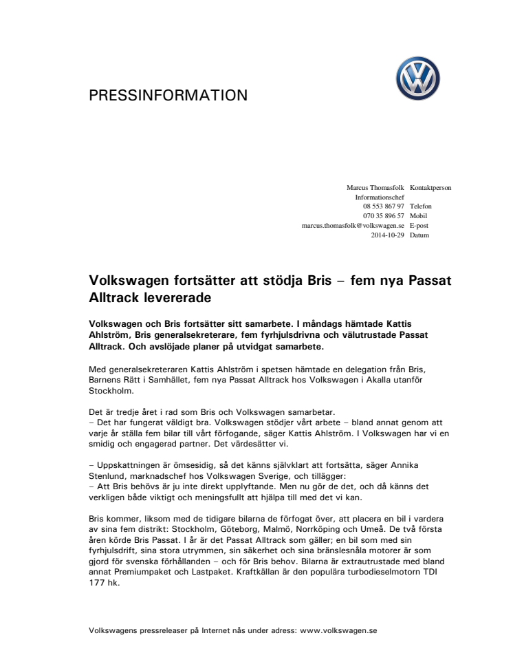 Volkswagen och Bris fortsätter sitt samarbete. I måndags hämtade Kattis Ahlström, Bris generalsekreterare, fem fyrhjulsdrivna och välutrustade Passat Alltrack. Och avslöjade planer på utvidgat samarbete.