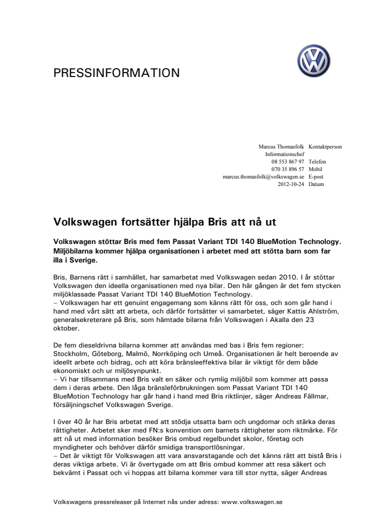 Bris, Barnens rätt i samhället, har samarbetat med Volkswagen sedan 2010. I år stöttar Volkswagen den ideella organisationen med nya bilar. Den här gången är det fem stycken miljöklassade Passat Variant TDI 140 BlueMotion Technology.