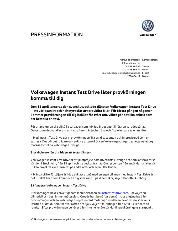 Den 13 april lanseras den svenskutvecklade tjänsten Volkswagen Instant Test Drive – ett världsunikt och helt nytt sätt att provköra bilar. För första gången någonsin kommer provkörningen till dig istället för tvärt om, vilket gör det lika enkelt som att beställa en taxi.