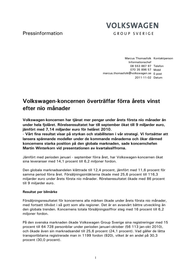 Volkswagen-koncernen har tjänat mer pengar under årets första nio månader än under hela fjolåret. Rörelseresultatet har till september ökat till 9 miljarder euro, jämfört med 7,14 miljarder euro för helåret 2010.