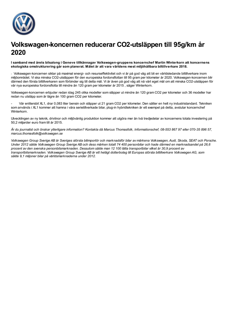 Volkswagen-koncernen reducerar CO2-utsläppen till 95g/km år 2020