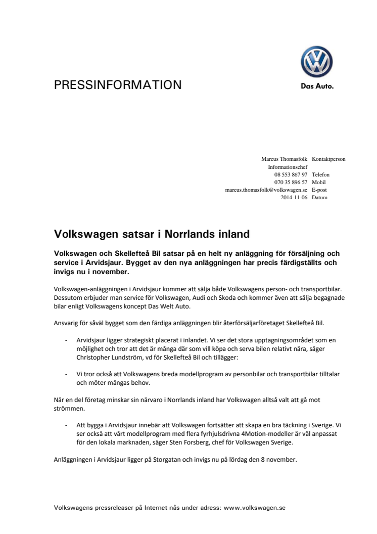 Volkswagen och Skellefteå Bil satsar på en helt ny anläggning för försäljning och service i Arvidsjaur. Bygget av den nya anläggningen har precis färdigställts och invigs nu i november.