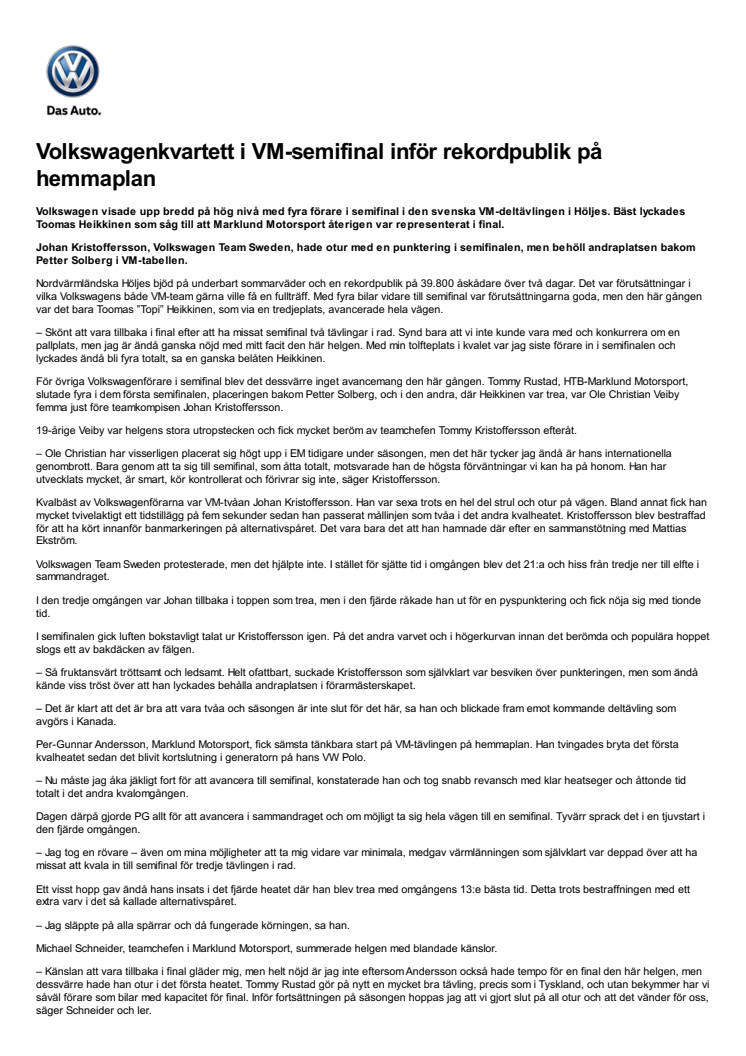 Volkswagen visade upp bredd på hög nivå med fyra förare i semifinal i den svenska VM-deltävlingen i Höljes. Bäst lyckades Toomas Heikkinen som såg till att Marklund Motorsport återigen var representerat i final.