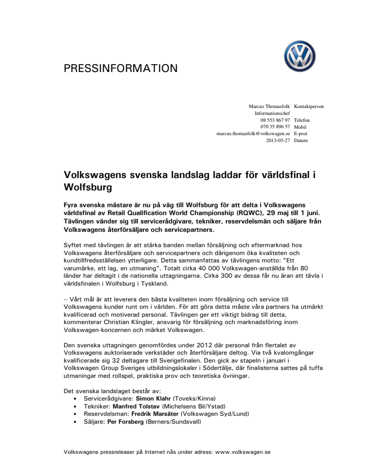 Fyra svenska mästare är nu på väg till Wolfsburg för att delta i Volkswagens världsfinal av Retail Qualification World Championship (RQWC), 29 maj till 1 juni. Tävlingen vänder sig till servicerådgivare, tekniker, reservdelsmän och säljare från Volkswagens återförsäljare och servicepartners.