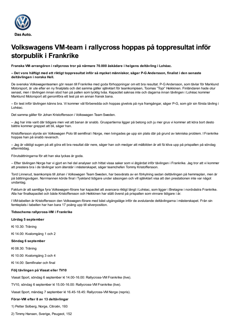 Volkswagens VM-team i rallycross hoppas på toppresultat inför storpublik i Frankrike
