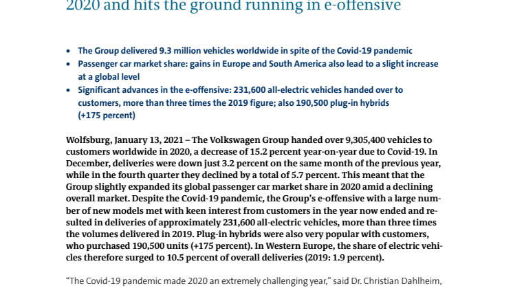 Volkswagen-koncernen överlämnade 9 305 400 fordon till kunder över hela världen 2020, en minskning med 15,2 procent jämfört med föregående år på grund av Covid-19. I december minskade leveranserna med endast 3,2 procent jämfört med samma månad föregående år, medan de under fjärde kvartalet minskade med totalt 5,7 procent. Detta innebar att koncernen utvidgade sin globala marknadsandel för personbilar något 2020 under en sjunkande totalmarknad.