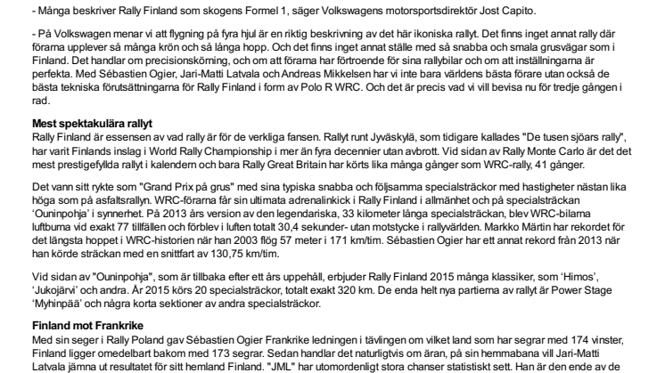 - På Volkswagen menar vi att flygning på fyra hjul är en riktig beskrivning av det här ikoniska rallyt. Det finns inget annat rally där förarna upplever så många krön och så långa hopp. Och det finns inget annat ställe med så snabba och smala grusvägar som i Finland. Det handlar om precisionskörning, och om att förarna har förtroende för sina rallybilar och om att inställningarna är perfekta. Med Sébastien Ogier, Jari-Matti Latvala och Andreas Mikkelsen har vi inte bara världens bästa förare utan också de bästa tekniska förutsättningarna för Rally Finland i form av Polo R WRC. Och det är precis vad vi vill bevisa nu för tredje gången i rad.