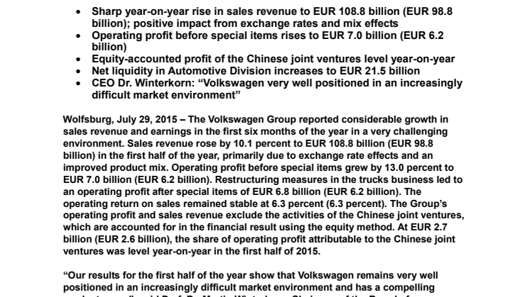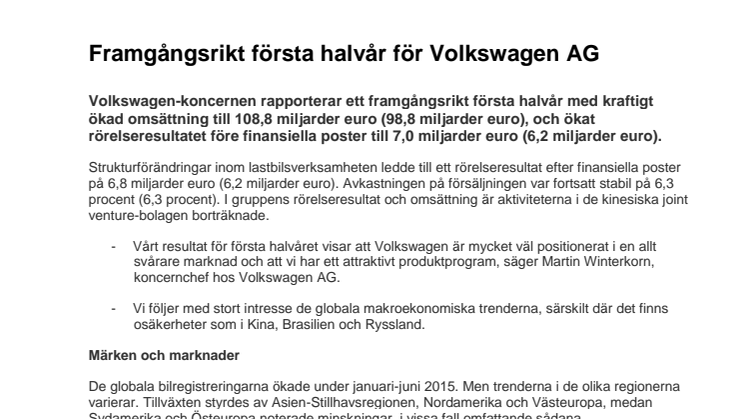 Volkswagen-koncernen rapporterar ett framgångsrikt första halvår med kraftigt ökad omsättning till 108,8 miljarder euro (98,8 miljarder euro), och ökat rörelseresultatet före finansiella poster till 7,0 miljarder euro (6,2 miljarder euro).