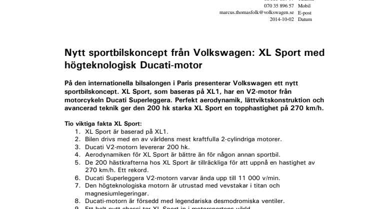 På den internationella bilsalongen i Paris presenterar Volkswagen ett nytt sportbilskoncept. XL Sport, som baseras på XL1, har en V2-motor från motorcykeln Ducati Superleggera. Perfekt aerodynamik, lättviktskonstruktion och avancerad teknik ger den 200 hk starka XL Sport en topphastighet på 270 km/h.
