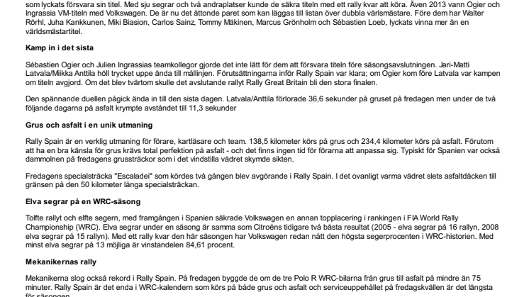 Tolfte rallyt och elfte segern, med framgången i Spanien säkrade Volkswagen en annan topplacering i rankingen i FIA World Rally Championship (WRC). Elva segrar under en säsong är samma som Citroëns tidigare två bästa resultat (2005 - elva segrar på 16 rallyn, 2008 elva segrar på 15 rallyn). Med ett rally kvar den här säsongen har Volkswagen redan nått den högsta segerprocenten i WRC-historien. Med minst elva segrar på 13 möjliga är vinstandelen 84,61 procent.