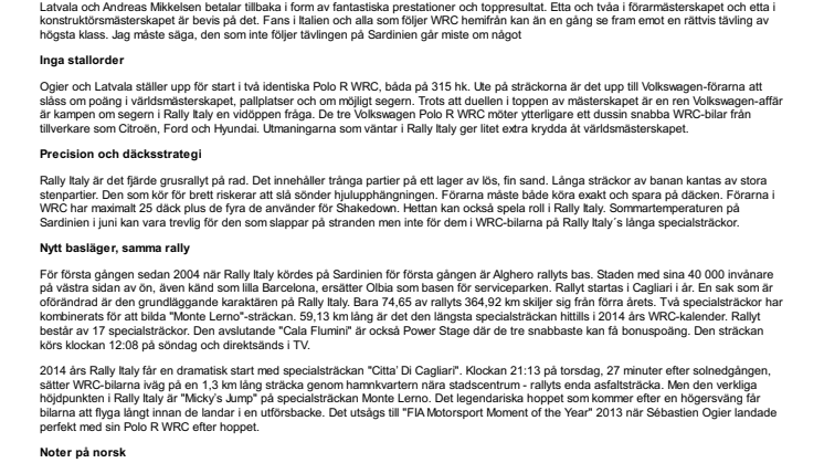 Kampen om ledningen i världsmästerskapet i rally, FIA World Rally Championship (WRC), står inför den sjätte omgången än en gång mellan två Polo R WRC. Sébastien Ogier/Julien Ingrassia (F/F) och Jari-Matti Latvala/Miikka Anttila (FIN/FIN) ställer upp i Rally Italy den 5:e till 8:e juni, båda med målet att förbättra sina positioner i världsmästerskapet. Det ena paret vill utöka sin ledning medan det andra siktar på att överta ledningen.