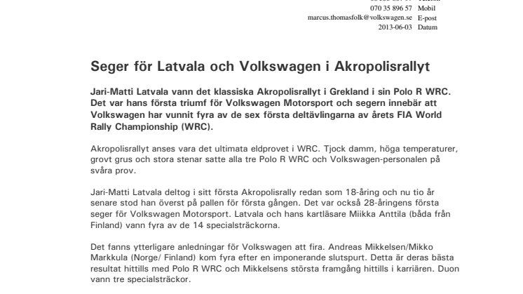 Seger för Latvala och Volkswagen i Akropolisrallyt