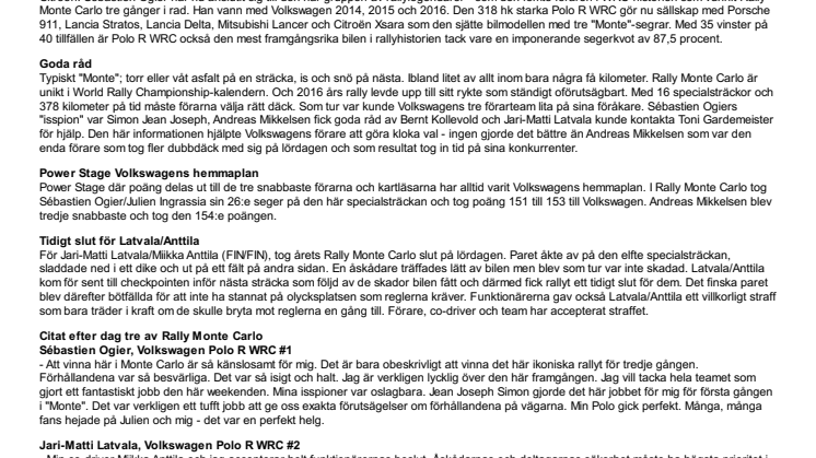 Sandro Munari gjorde det med Lancia, Walter Röhrl med Opel, Lancia och Audi, Tommi Mäkinen med Mitsubishi och Sébastien Loeb med Citroën. Sébastien Ogier har nu anslutit sig till den här gruppen av rallylegendarer - som den femte föraren i WRC-historien som vunnit Rally Monte Carlo tre gånger i rad. Han vann med Volkswagen 2014, 2015 och 2016. Den 318 hk starka Polo R WRC gör nu sällskap med Porsche 911, Lancia Stratos, Lancia Delta, Mitsubishi Lancer och Citroën Xsara som den sjätte bilmodellen med tre "Monte"-segrar. Med 35 vinster på 40 tillfällen är Polo R WRC också den mest framgångsrika bilen i rallyhistorien tack vare en imponerande segerkvot av 87,5 procent.