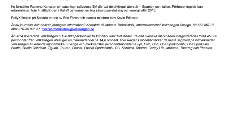 Är du journalist och önskar ytterligare information? Kontakta då Marcus Thomasfolk, Informationschef Volkswagen Sverige, 08-553 867 97 eller 070-35 896 57, marcus.thomasfolk@volkswagen.se