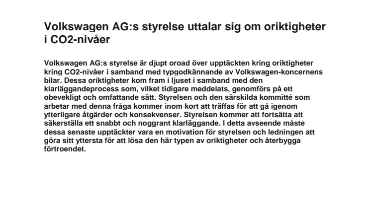 Volkswagen AG:s styrelse är djupt oroad över upptäckten kring oriktigheter kring CO2-nivåer i samband med typgodkännande av Volkswagen-koncernens bilar. Dessa oriktigheter kom fram i ljuset i samband med den klarläggandeprocess som, vilket tidigare meddelats, genomförs på ett obevekligt och omfattande sätt. Styrelsen och den särskilda kommitté som arbetar med denna fråga kommer inom kort att träffas för att gå igenom ytterligare åtgärder och konsekvenser. Styrelsen kommer att fortsätta att säkerställa ett snabbt och noggrant klarläggande. I detta avseende måste dessa senaste upptäckter vara en motivation för styrelsen och ledningen att göra sitt yttersta för att lösa den här typen av oriktigheter och återbygga förtroendet.