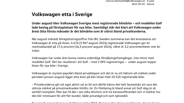 Under augusti blev Volkswagen Sveriges mest registrerade bilmärke – och modellen Golf lade beslag på förstaplatsen för nya bilar. Samtidigt står det klart att Volkswagen under årets åtta första månader är det bilmärke som är störst bland privatkunderna.