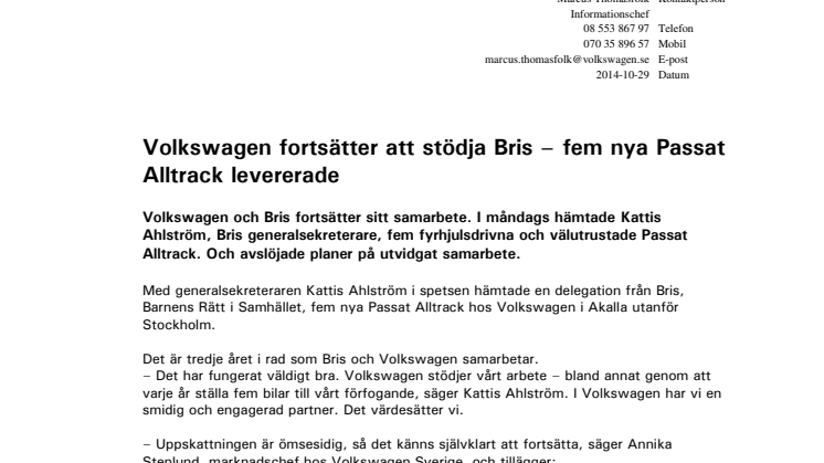 Med generalsekreteraren Kattis Ahlström i spetsen hämtade en delegation från Bris, Barnens Rätt i Samhället, fem nya Passat Alltrack hos Volkswagen i Akalla utanför Stockholm. Det är tredje året i rad som Bris och Volkswagen samarbetar.