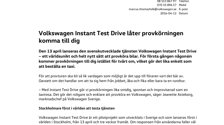 Den13 april lanseras den svenskutvecklade tjänsten Volkswagen Instant Test Drive – ett världsunikt och helt nytt sätt att provköra bilar. För första gången någonsin kommer provkörningen till dig istället för tvärt om, vilket gör det lika enkelt som att beställa en taxi.
