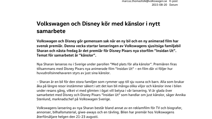 Volkswagen och Disney gör gemensam sak när en ny bil och en ny animerad film har svensk premiär. Denna vecka startar lanseringen av Volkswagens sjusitsiga familjebil Sharan och nästa fredag är det premiär för Disney Pixars nya storfilm ”Insidan Ut”. Temat för samarbetet är ”känslor”.
