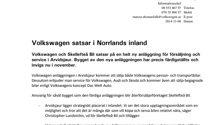 Är du journalist och önskar ytterligare information? Kontakta då Christopher Lundström, VD Skellefteå Bil AB, 070-6818050 eller christopher.lundstrom@skellefteabil.se eller Marcus Thomasfolk, Informationschef, 08-553 867 97 eller 070-35 896 57, marcus.thomasfolk@volkswagen.se