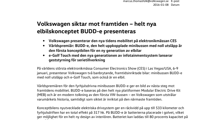 På världens största elektronikmässa Consumer Electronics Show (CES) i Las Vegas/USA, 6-9 januari, presenterar Volkswagen två banbrytande, framtidsinriktadebilar: minibussen BUDD-e med noll utsläpp och e-Golf Touch, som också är en elbil.
